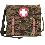 42-773 German Style Medic Bag - Digital Woodland Heavyweight canvas construction Imprinted with red cross-first aid insignia Main compartment with leather closure straps Adjustable shoulder strap Size - 12.5" x 10.25" x 3" Color - Digital Woodland