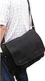 On sale is a classic European military style messenger bag but it is still one of the most fashionable bags nowadays. This messenger bag has a roomy protective compartment that keeps laptop up to 15.6 inches safe and secure. Features: -Made from heavy duty durable canvas. -Dimension: 15.5" x 12.5" x 5". -Main compartment with zippered top closure. -Built in padded laptop sleeve with Velcro top closure to keep laptop securely in place. -1 large compartment, 2 front pockets and 2 side pockets. -Adjustable shoulder strap. -Full inner lining. -Color: Black